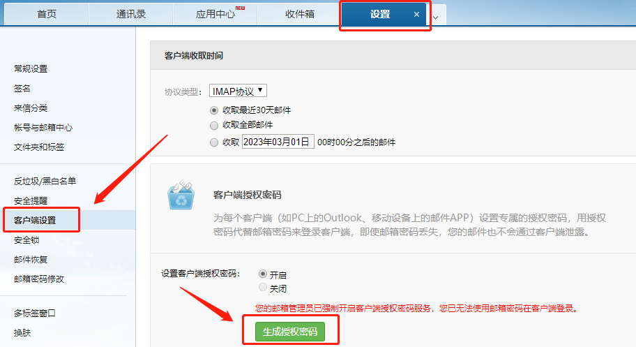 一、获取客户端授权码作为邮箱密码(老客户端用户只需更新邮箱密码为客户端授权码)