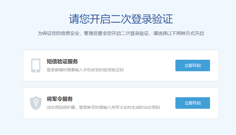 因公共邮箱有多人使用的特殊性和不安全性,邮件系统为此提供2种二次验证方案,用户可自行选择。