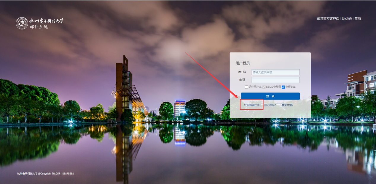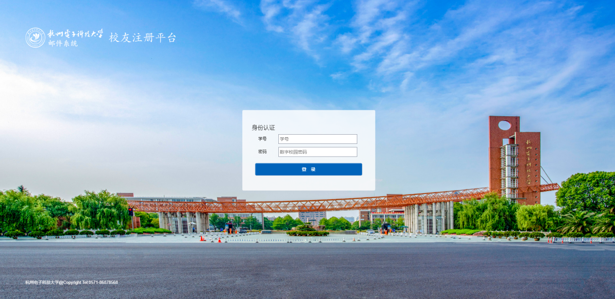 输入在校期间数字校园的账号密码,点击登录后系统默认注册“学工号@alu.hdu.edu.cn”的邮箱。
